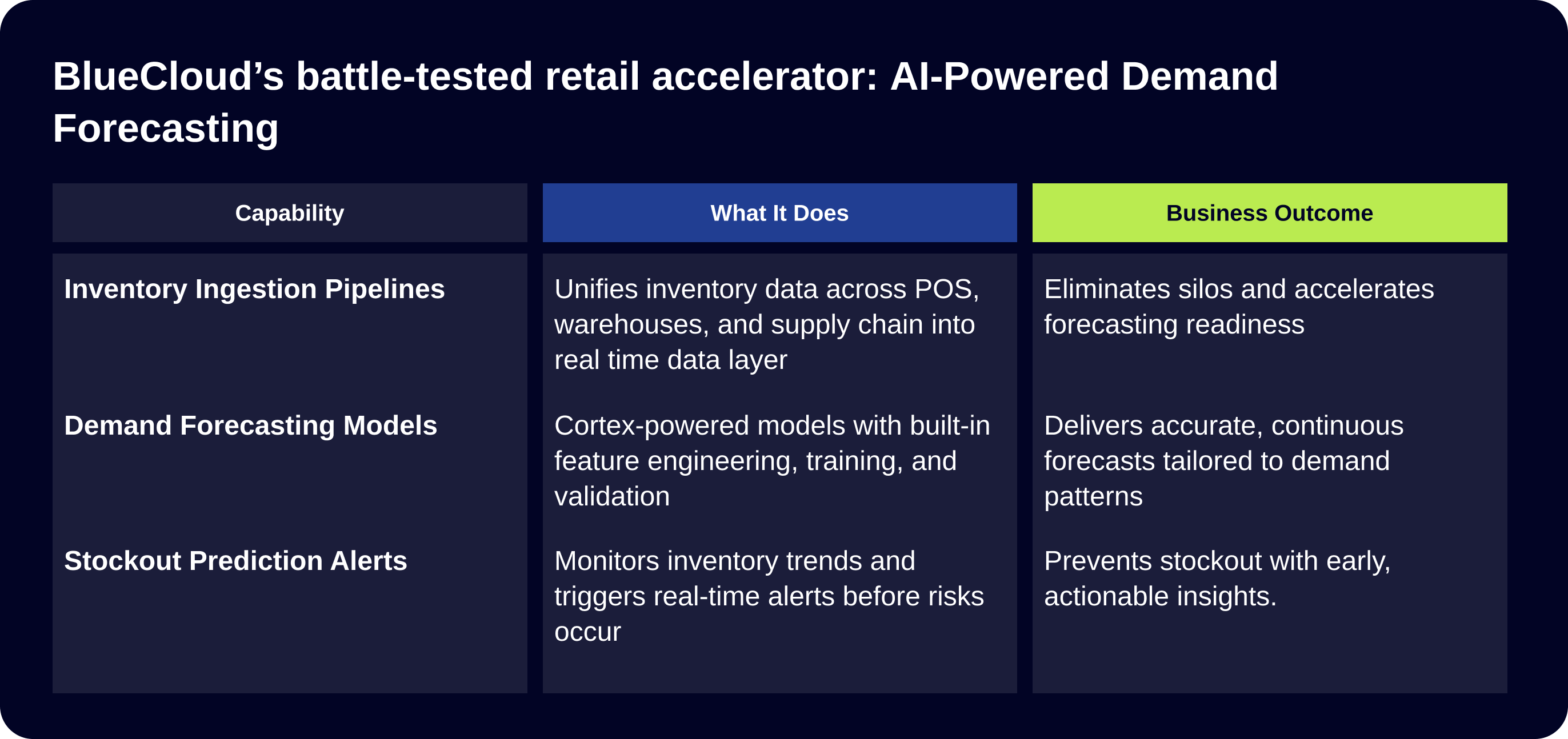 Delivery is significantly accelerated through BlueCloud’s battle-tested retail accelerator, Demand Forecasting Model, built from 200+ enterprise implementations and purpose-built for inventory and demand use cases.